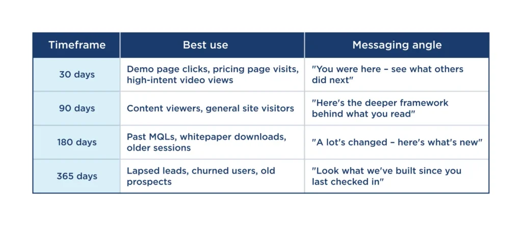Not all “warm” audiences carry equal intent. The key is matching messaging to recency and engagement level through defined retargeting buckets: